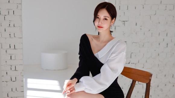 孙允珠迷人穿搭: 黑白错位后现代艺术挂领衣裙